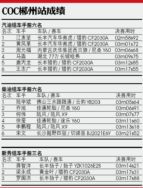 | qiyouzudejuesaijianzhishishangcishamenzhandefanban,yiranshixibeilangdezhouyuanfududouhuananhudejianghuijianhehuangfengge。butongdeshi,chenzhoudebisaimeiyouxiayu,saidaoyebunining,jianghuijianhehuangfenggejiashiliebaosaichezaizhelidazhanxiongfeng,errenjiashifenggexionghenchenwen,jiangliebaosaichetisuxunmeng、操控靈巧的特點發揮到了極致,兩人雙雙勝過周元福,包攬前兩名,特別是江惠堅的決賽用時是2 分58 秒92,是全場惟一一位跑進三分鍾內的車手。賽後,江惠堅說:“今jin天tian感gan覺jiao特te別bie興xing奮fen,拿na了le這zhe個ge冠guan軍jun,對dui接jie下xia來lai在zai陽yang山shan衝chong擊ji年nian終zhong總zong冠guan軍jun就jiu有you了le更geng多duo保bao障zhang。由you於yu決jue賽sai取qu消xiao了le駝tuo峰feng障zhang礙ai,這zhe意yi味wei著zhe競jing爭zheng更geng加jia激ji烈lie,所suo以yi我wo全quan力li去qu跑pao,其qi實shi有you的de地di方fang跑pao得de挺ting險xian,尤you其qi第di二er圈quan在zai過guo深shen坑keng時shi,由you於yu速su度du太tai快kuai還hai磕ke了le一yi下xia。”黃鳳革則有點遺憾:“meinengnadaoguanjuntingyihande,buguowojinlezijidequanli。jintianwodezhuangtaibushihenhao,ganmaole,laidaosaichangshinaodaiyunyunde,erqiewodesaichehaiyoudianxiaowenti。chenzhousaidaogeiwoliuxialefeichanghaodeyinxiang,zhelikeyishuoduisudu、經驗和技術都是一次很好的考驗,希望明年我還能來這裏比賽,這真是一條很棒的賽道。” |