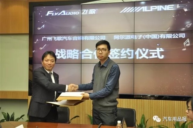 2017年12月28日下午3點整,廣州飛歌汽車音響有限公司與阿爾派電子(中國)有限公司強強聯手,雙方達成合作意願,共同舉辦聯合簽約會。阿爾派電子(中國)有限公司品牌事業部部長幸田剛、副部長呂明剛,阿爾派電子(中國)有限公司潘誌濱,飛歌後裝事業部總經理梁澤源、銷售總監朱冠西,品牌經理趙之桔以及行業媒體嘉賓出席此次簽約會。《汽車用品報》作現場報道。