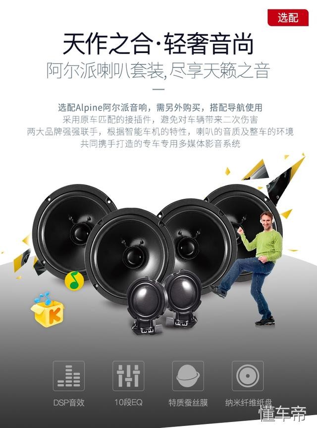 據了解,這套阿爾派喇叭的高音單元采用的是日本特製蠶絲高音振膜,解析度高、延展性強,低音音盆則采用了納米纖維紙盤並做了表麵塗層高密度處理,發聲容易。對比原車喇叭,在發音上的區別巨大。