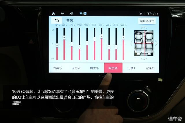 同時飛歌GS1的功率達4*50W,(一般原車主機功率在10-25W左右),功率越高能夠推動喇叭的音質效果越好。再加上GS1在其音源部分做了產品升級,內置的DSP音效處理器解決了音源的問題,還有裏麵的10段EQ調頻,更是將音樂的質感推升到極致!