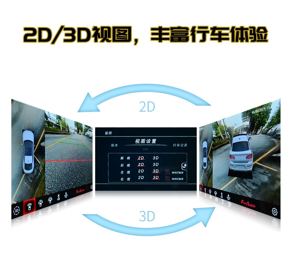 新增3D視圖,支持2D/3D視shi圖tu隨sui意yi切qie換huan,多duo場chang景jing協xie助zhu車che主zhu看kan清qing四si周zhou。三san維wei立li體ti視shi圖tu視shi覺jiao效xiao果guo更geng加jia立li體ti豐feng富fu,仿fang真zhen道dao路lu行xing駛shi畫hua麵mian,視shi覺jiao更geng直zhi觀guan,增zeng強qiang行xing車che體ti驗yan感gan。多duo種zhong視shi圖tu模mo式shi,針zhen對dui性xing場chang景jing應ying用yong,新xin增zeng流liu媒mei體ti視shi圖tu,超chao廣guang角jiao視shi野ye,盲mang區qu的de頭tou號hao“殺手”。