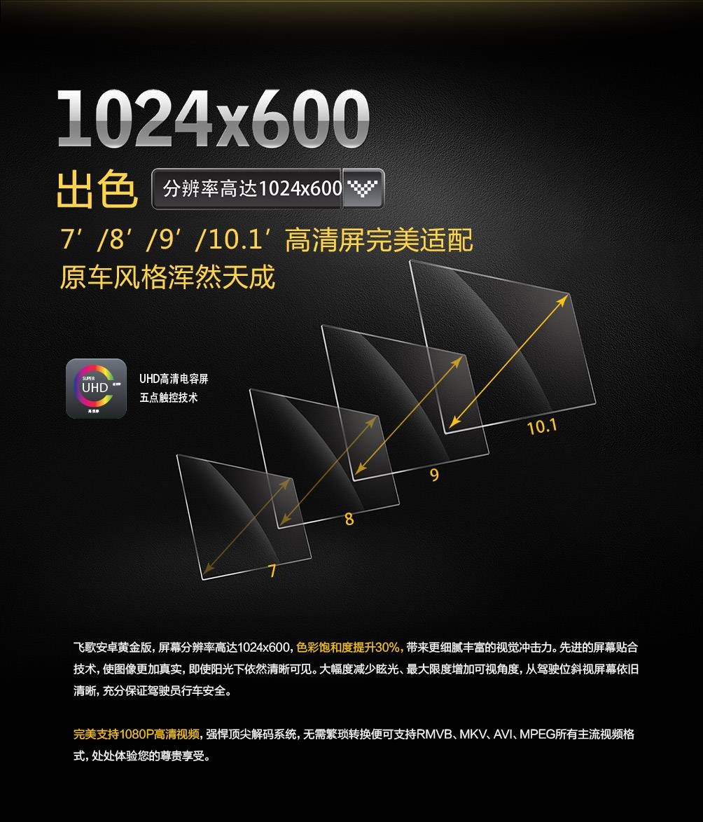 1024*600高清晰分辨率,色彩飽和度大大提升,讓畫麵更出色,給你高清視界。UHD高清電容屏,五點觸控技術,7/8/9/10寸,高清屏完全適配,與原車風格渾然天成!