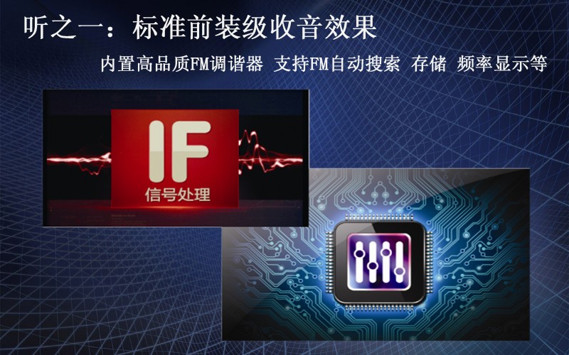 采用低中頻調諧器高性能芯片,完全集成的調諧係統,具有低相位噪聲和快速數字IF信號處理,超強抗幹擾。內置高品質的FM調諧器,支持FM自動搜索、存儲、頻率顯示、音色以及靈敏度調整。