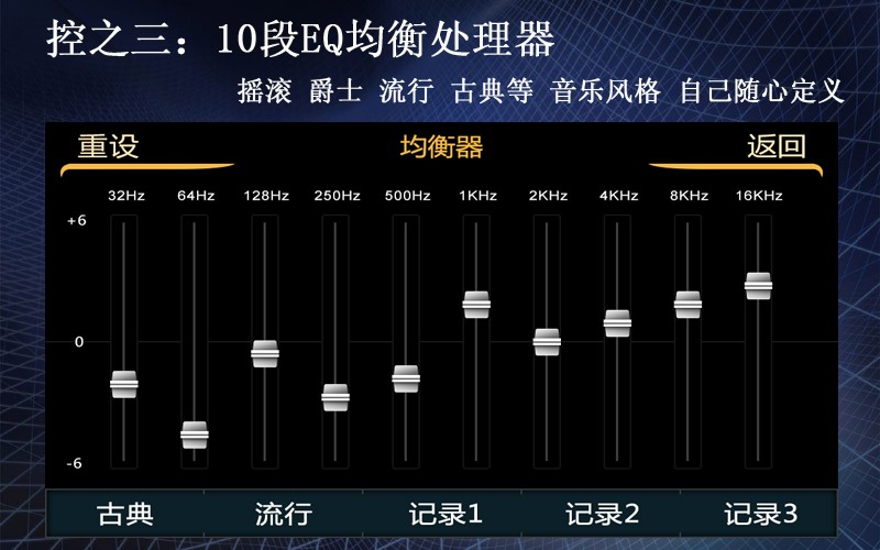 飛歌奧迪係列專用導航,擁有DSP數字音效處理技術,分解出中低高音,形成10段EQ均衡器,搖滾、爵士、流行、古典隨心選擇,音樂風格,自己定義。帶來高保真、超越原車的多媒體音質效果。音樂風格,自由操控。