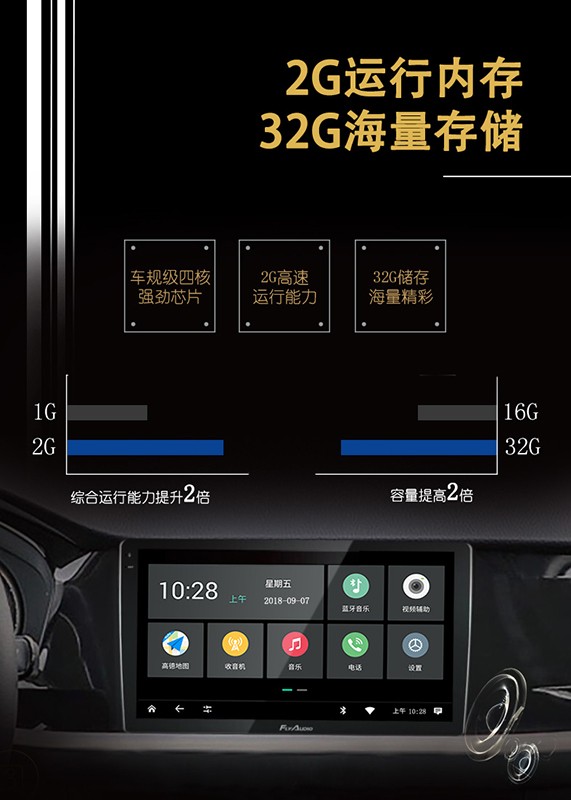 Android6.0高度定製係統,車規級全新FlyAudio UI,符合車載安全駕駛操作習慣的設計,由繁入簡,信息聚合,人性化交互呈現,全新定製車載級係統。