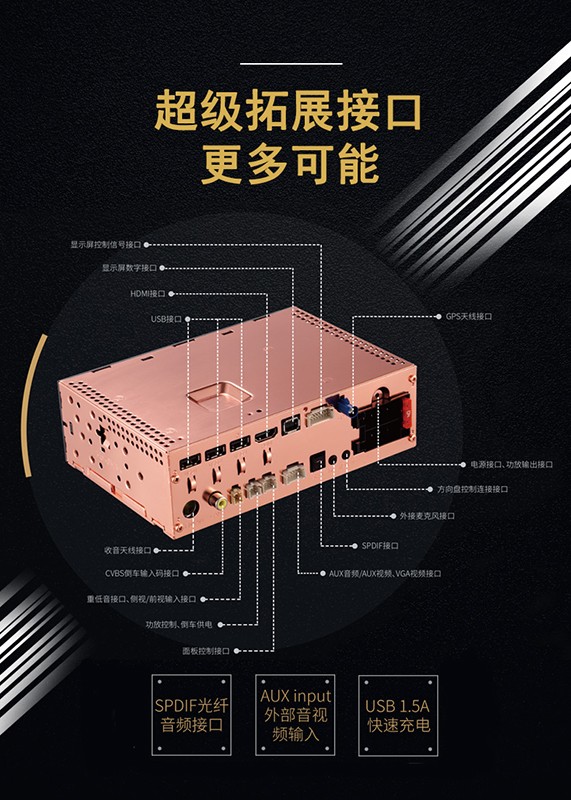 預留SPDIF光纖音頻輸出接口、重低音音頻輸出接口,AUX input外部音視頻輸入,為發燒友後續拓展提供更多可能!同時,雙攝像頭輸入在路途安全方麵讓危險因素無處遁形!