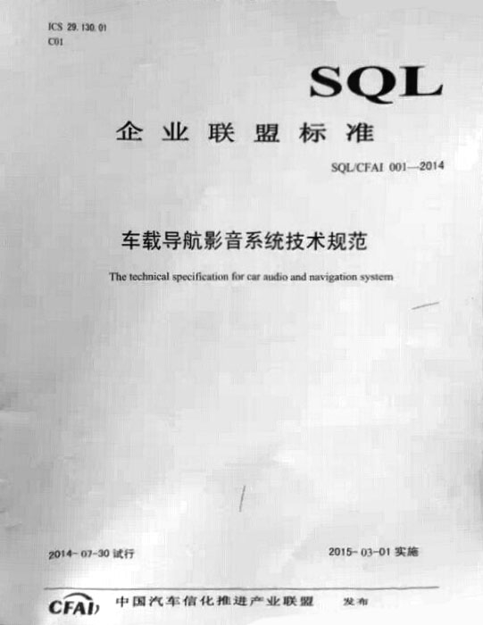 《車載導航影音係統技術規範》由中國汽車信息化推進產業聯盟(CFAI)組(zu)織(zhi)定(ding)製(zhi)。此(ci)次(ci)製(zhi)定(ding)行(xing)業(ye)標(biao)準(zhun),由(you)業(ye)內(nei)多(duo)家(jia)車(che)載(zai)導(dao)航(hang)廠(chang)家(jia)參(can)與(yu)起(qi)草(cao),內(nei)容(rong)權(quan)威(wei)。對(dui)於(yu)提(ti)升(sheng)行(xing)業(ye)內(nei)的(de)產(chan)品(pin)品(pin)質(zhi),為(wei)消(xiao)費(fei)者(zhe)奉(feng)獻(xian)最(zui)滿(man)意(yi)的(de)產(chan)品(pin),意(yi)義(yi)重(zhong)大(da)。