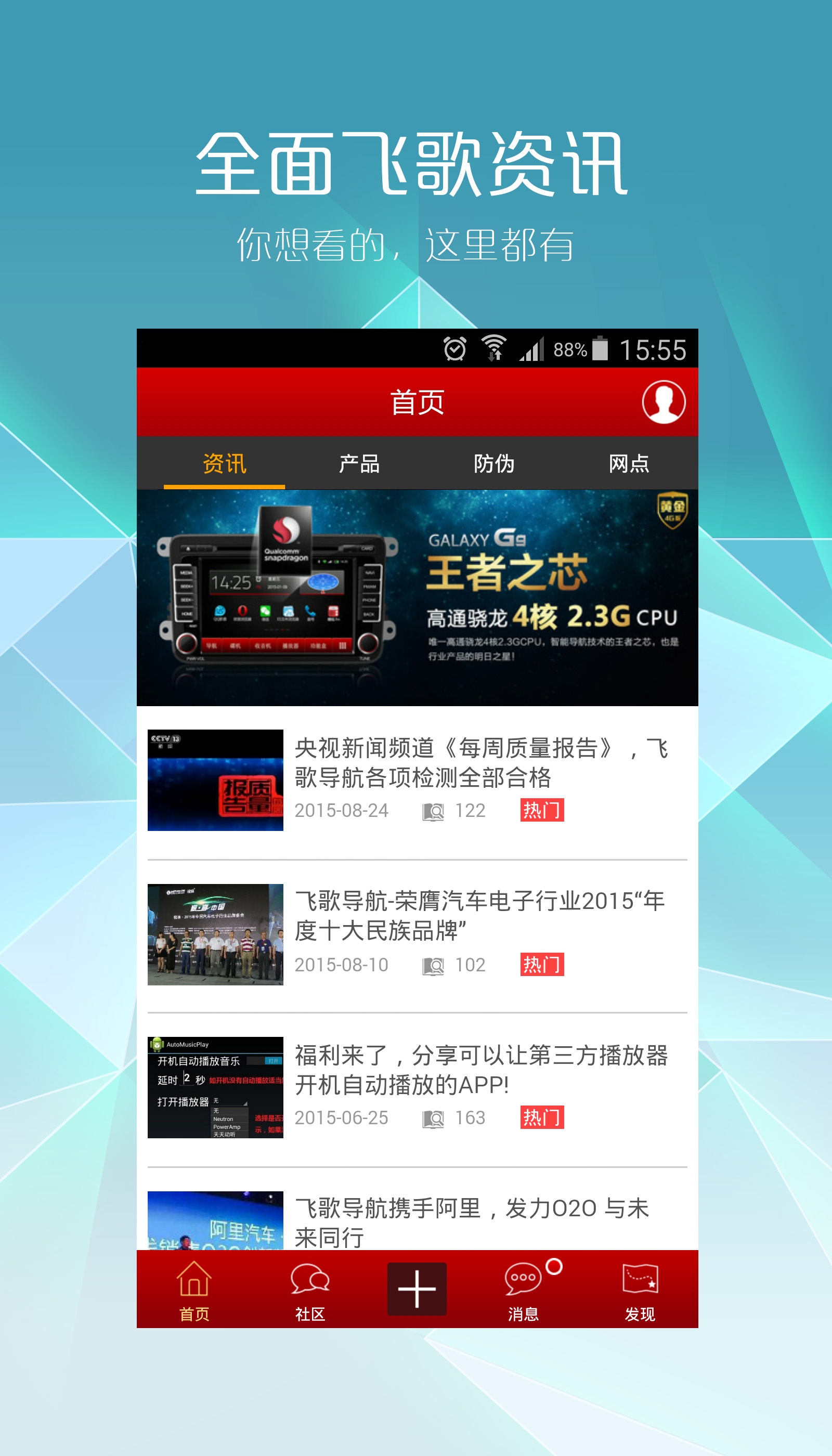 飛歌論壇APP將為所有飛歌客戶提供行業新聞資訊、產品在線搜索和介紹、全國經銷商實時查詢以及在線防偽驗證等實用訊息。