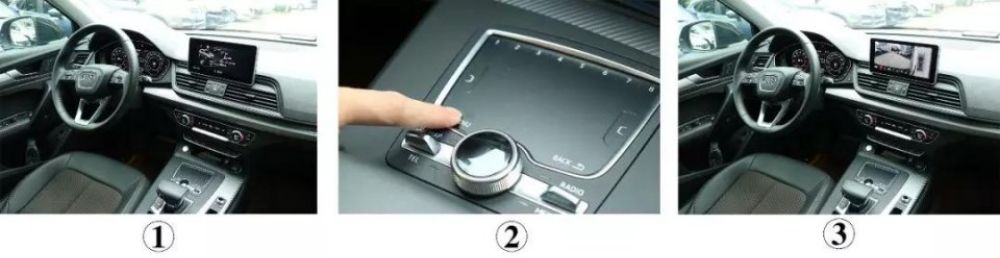 我們可以通過原車奧迪MMI觸控板即可操作360°全景影像,拋棄以往遙控器的死板操作。那怎麼進入全景界麵呢?三種方法,一:長按觸控板上的Menu鍵兩秒進入全景界麵;二:打左右轉向燈(車速低於 25km/h),進入左右視對應的界麵;三:掛倒車檔進入後視界麵;