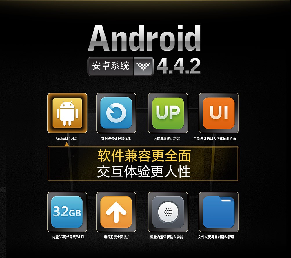 采用最新安卓係統4.4.2,精準把握科技脈搏,軟件兼容更加全麵,交互體驗更加人性。內置3G網絡無限WIFI,運行速度全麵提升。
