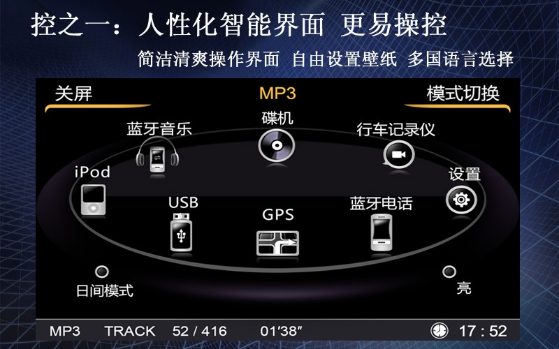 人(ren)性(xing)化(hua)操(cao)作(zuo)界(jie)麵(mian),簡(jian)潔(jie)大(da)方(fang),更(geng)易(yi)操(cao)控(kong),同(tong)時(shi),用(yong)戶(hu)可(ke)自(zi)由(you)設(she)置(zhi)壁(bi)紙(zhi),界(jie)麵(mian)風(feng)格(ge)自(zi)由(you)定(ding)義(yi)。並(bing)提(ti)供(gong)多(duo)國(guo)語(yu)言(yan)選(xuan)擇(ze),愛(ai)好(hao)外(wai)語(yu)的(de)車(che)主(zhu),也(ye)可(ke)以(yi)隨(sui)心(xin)轉(zhuan)換(huan)。