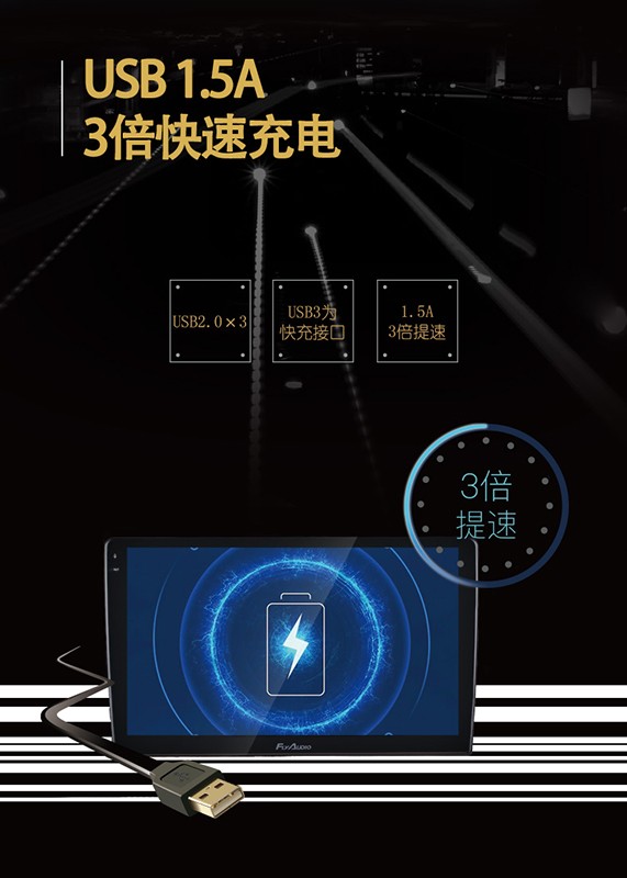 支持USB 1.5A快速充電,達到普通車機充電的3倍速度。出門在外,手機沒電,飛歌X1智能音樂車機1.5A快速充電高效傳輸,讓你體驗快速充電的魅力。