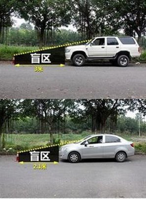同時,經過對市麵上兩種車型——SUV和家轎車的實地測量並對比,小型車前部盲區縱向距離有2.1米,而SUV前部盲區縱向距離則達到3米之廣。