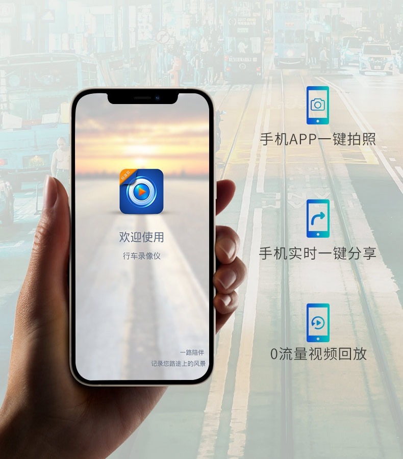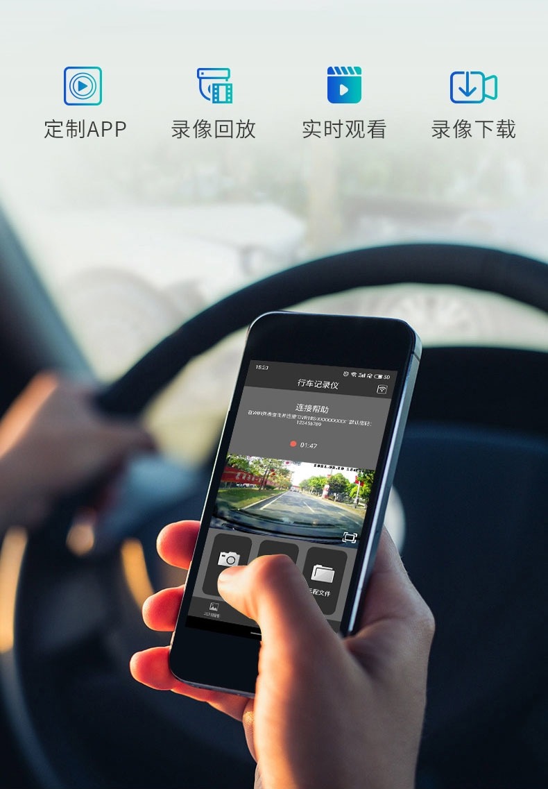 專屬手機APP輕鬆查看愛車畫麵,通過手機連接DVR,打開APP即可對設備錄像進行設置或查看相關行程;支持一鍵拍照,實時一鍵分享、設備設置等功能,帶來更順暢的行車體驗。